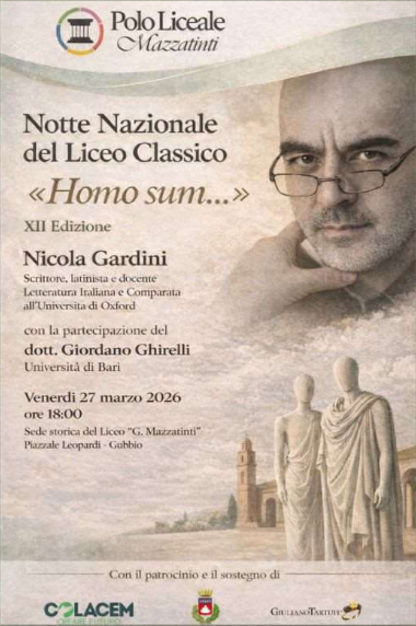 Si svolgerà venerdì 27 marzo, la XII edizione della “Notte Nazionale del Liceo Classico” al polo Mazzatinti di Gubbio. Tema di quest'anno “Homo sum...”, incontro con il prof. Nicola Gardini, scrittore, latinista e docente di Letteratura Italiana e Comparata all'Università di Oxford. Con la partecipazione del dott. Giordano Ghirelli dell'Università di Bari. Appuntamento dalle ore 18 nella sede di Piazzale Leopardi.