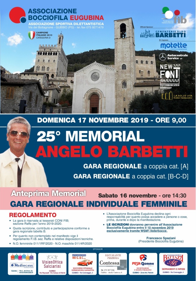 Prenderà il via domenica mattina alle ore 9,00 presso il bocciodromo comunale di Gubbio il 25esimo memorial Angelo Barbetti, una delle gare a “coppia” più attese dell’anno da tutti i giocatori di bocce dell’Umbria e delle regioni limitrofe. A confermarlo sono state le numerose iscrizioni ricevute dalla Bocciofila Eugubina, con ben 256 coppie provenienti da tutto il centro Italia.Gli atleti, divisi per categorie si affronteranno, raggruppati in 8 formazioni per girone, dal quale uscirà un vincitore per girone. Nel pomeriggio i vincenti di ogni girone, si affronteranno al bocciodromo di Gubbio ad incontri ad eliminazione diretta, fino alla finalissima prevista per le ore 19. Sabato invece dalle ore 14,30 fissata una gara regionale femminile specialità individuale, che farà da anteprima al Memorial con 40 partecipanti. Nella categoria maschile saranno ben 13 le formazioni eugubine che si sono iscritte per tentare di conquistare il primo posto.