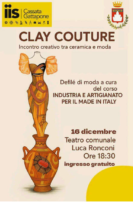 Torna il tradizionale evento del mese di Dicembre del corso Industria e Artigianato per il Made in Italy dell’IIS CASSATA GATTAPONE. Con il sostegno dell’Amministrazione comunale, martedì 16 dicembre alle ore 18:30 presso il Teatro comunale Luca Ronconi andrà in scena CLAY COUTURE: INCONTRO CREATIVO TRA CERAMICA E MODA, il défilé delle realizzazioni delle studentesse del corso Moda ispirate alla produzione ceramica di artisti – artigiani del territorio. La collezione è nata dal tema di Umbria Fashion 2025 che ha nutrito il percorso di progettazione nelle classi di Fashion Design che hanno studiato, approfondito ed incontrato importanti figure della ceramica contemporanea e la loro produzione caratterizzata da elementi ed approcci di design. I lavori di Lucia Angeloni, Maurizio Tittarelli Rubboli e la produzione a bucchero della manifattura Antonio Rossi sono stati declinati, prima nella progettazione e poi nella confezione, in chiave moda, la ceramica si è così fatta tessuto, forma, volume e lavorazione. Le fasi di modellizzazione e confezione hanno potuto usufruire dei nuovi strumenti informatici ed elettronici presenti nei nuovi laboratori grazie al progetto “Istituti d’eccellenza del sistema moda “promosso da Confindustria Umbria sezione Industria dell’Abbigliamento e al finanziamento di Fondazione Perugia. In occasione del défilé saranno anche premiate le scuole secondarie di primo grado che hanno partecipato al contest “ Lablog-Idee che lasciano il segno” patrocinato dal Comune di Gubbio.