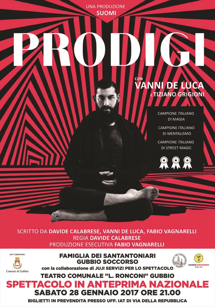 La Famiglia dei Santantoniari e GubbioSoccorso con il patrocinio del Comune di Gubbio e la collaborazione della JUJI Servizi per lo Spettacolo stasera alle ore 21 al Teatro "Ronconi" presentano in anteprima nazionale lo spettacolo "Prodigi". Si tratta di uno spettacolo in cui protagonista assoluto è Vanni De Luca, autentico specialista delle meraviglie, un uomo che è riuscito ad utilizzare il proprio corpo in maniera straordinaria grazie ad un allenamento quotidiano e costante sviluppato in molti anni. Si va dalla capacità di ricordare centinaia di pagine di un libro, risolvere in pochi secondi complicatissimi enigmi matematici, spingere il proprio corpo oltre i limiti della natura, scrivere e parlare al contrario, risolvere il cubo di Rubik mentre si declama a memoria canti della Divina Commedia scelti dal pubblico, fino ad arrivare al suo numero di punta: le Meraviglie Multiple.