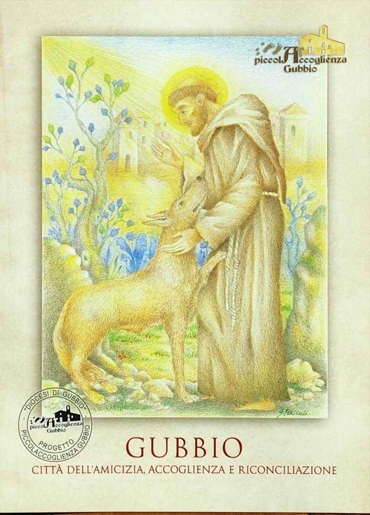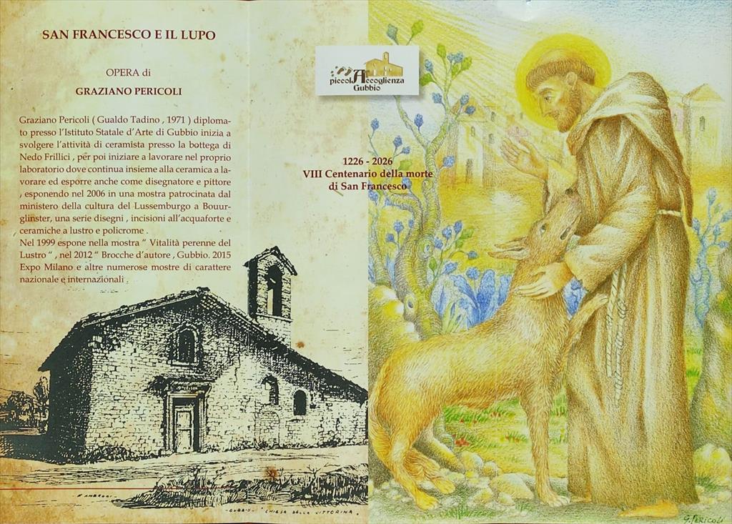 Il tema è quello iconico dell'ammansimento del lupo per opera di San Francesco, un tributo agli 800 anni dalla sua morte, ma le tonalità scelte per questa cartolina del pellegrino 2026 presentata dalla Piccola Accoglienza di Gubbio presso la chiesa della Misericordia, sono un omaggio alla tradizione ceramica della città. Nè poteva essere diversamente visto che l'artista scelto e presentato da Ettore Sannipoli, è un ceramista di lunga esperienza come il gualdese Graziano Pericoli che ha voluto ricordare i colori della ceramica istoriata rinasicmentale di derivazione mastro giorgesca.