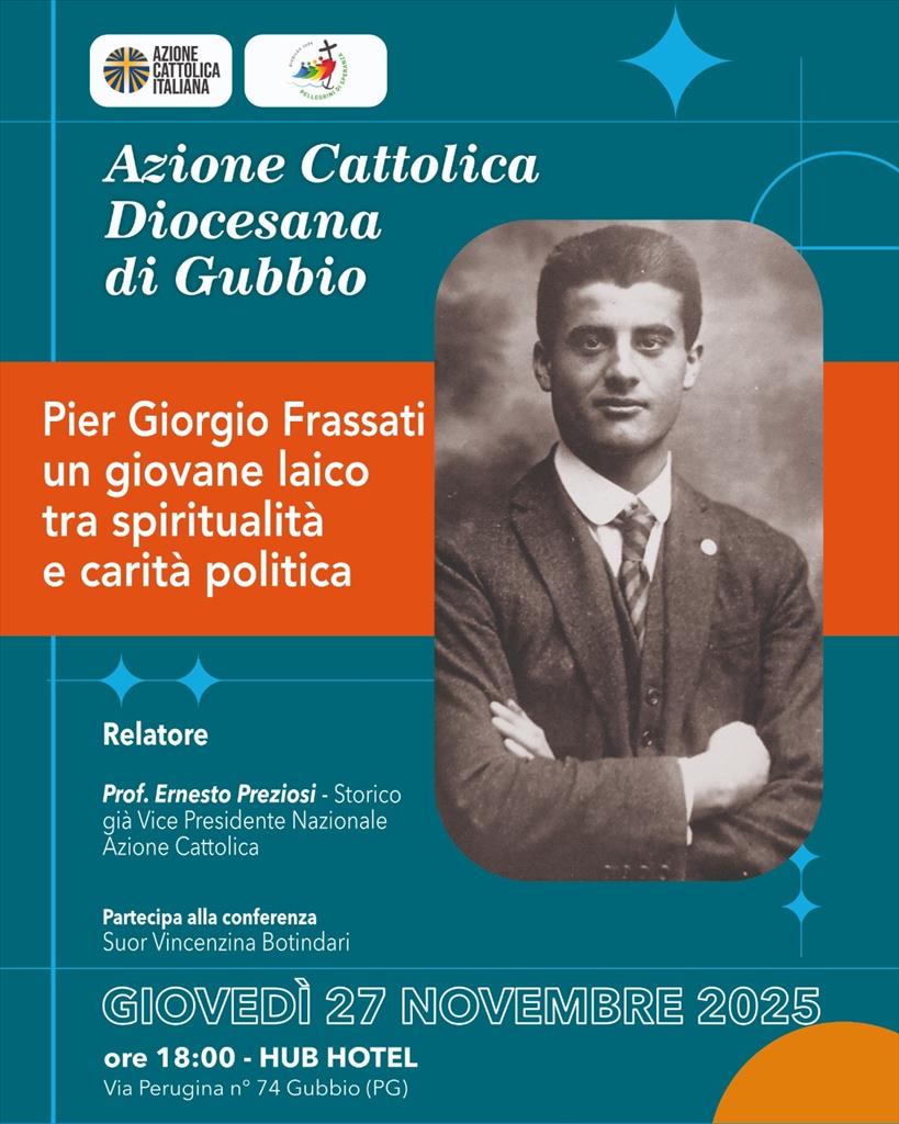 Si svolgerà oggi, giovedì 27 novembre alle ore 18, all'Hub Hotel di Gubbio, la conferenza su "Pier Giorgio Frassati, un giovane laico tra spiritualità e carità politica". Relatore, prof. Ernesto Preziosi, storico già Vice Presidente Nazionale Azione Cattolica. Partecipa, Suor Vincenzina Botindari. Iniziativa dell'Assiociazione Cattolica Diocesana di Gubbio.