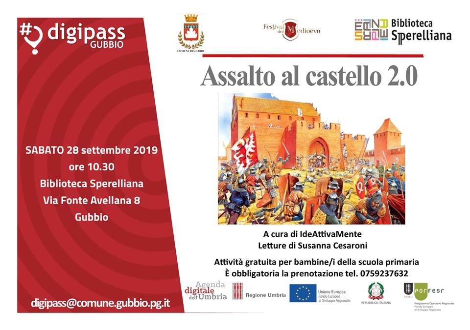 Si svolgerà domani, sabato 28 settembre 2019, dalle ore 10.30 alle ore 12.30, l’iniziativa "Assalto al castello 2.0". Il laboratorio creativo partirà con la lettura di storie ambientate nel Medioevo per arrivare alla costruzione di balestre 2.0 utili a sferrare l’assalto al castello. L’attività, che unisce abilità costruttive, creatività, coding e una mira infallibile per conquistare le segrete del castello, è a cura del Digipass Gubbio, Ideattivamente e Biblioteca Sperelliana., è gratuita ed è rivolta a bambine/i della scuola primaria. E’ necessaria la prenotazione in Biblioteca telefonando al seguente numero: 075 9237632.