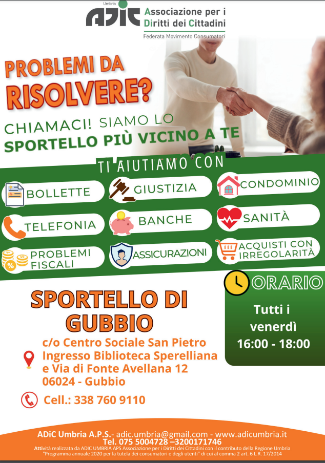 Verrà inaugurato a Gubbio venerdì 26 settembre alle ore 11 il nuovo sportello di ADIC, l'Associazione per i Diritti dei Cittadini. Questo nuovo punto di riferimento sarà collocato nel Centro Sociale San Pietro, con ingresso dalla Biblioteca Sperelliana e via di Fonte Avellana 12. Il nuovo sportello si propone come un punto d'ascolto e di supporto per i cittadini eugubini. Offrirà consulenza gratuita e assistenza qualificata su diverse tematiche, come la tutela dei consumatori, i diritti legali e le questioni burocratiche. Per maggiori informazioni, è possibile contattare il numero di telefono 338 760 9110 o visitare il sito web ufficiale dell'associazione: www.adicumbria.it.