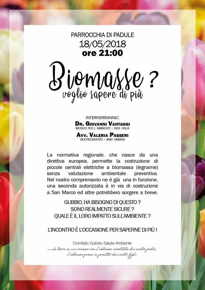 Gubbio, è in programma stasera dalle ore 21 l'incontro sul tema delle biomasse tornato al centro dell'attenzione in particolare per la comunità di Padule-S.Marco, a est di Gubbio. Il dibattito si è acceso da alcune settimane dopo la notizia della attivazione ormai prossima di un impianto a cippato operativo nella zona, una presenza che non da tutti è stata valutata in termini positivi e non è mancata preoccupazione. Già in Consiglio comunale il comitato di residenti ha manifestato chiedendo lumi all'amministrazione comunale e chiedendo garanzia sulla salubrità dell'operazione. Stasera, all'iniziativa dal titolo "Biomasse, voglio sapere di più", promossa dal comitato Salute e Ambiente presso il circolo parrocchiale, parleranno il dr. Giovanni Vantaggi (medico per l'ambiente) e Valeria Passeri (WWF Umbria).