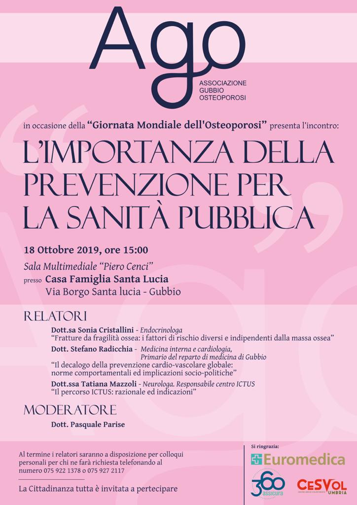 La prevenzione dell'osteoporosi passa attraverso una corretta informazione su semplici abitudini da assumere già in età giovanile, per garantire la salute della propria struttura ossea: se ne parlerà nel convegno in programma oggi pomeriggio (ore 15.30) alla Casa Famiglia S.Lucia di Gubbio (sala Cenci), promosso dall'associazione AGO (Gubbio Osteoporosi). Tra i relatori, la dr.ssa Sonia Cristallini, endocrinologa, il dr. Stefano Radicchia, primario del reparto di Medicina dell'ospedale di Gubbio-Gualdo Tadino, e la dr.ssa Tatiana Mazzoli, neurologa.