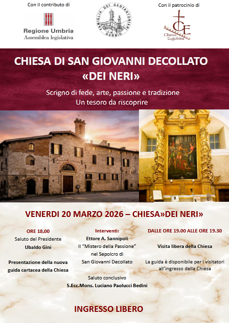 Venerdi prossimo, 20 Marzo, alle ore 18, sarà presentata la guida sulla Chiesa di San Giovanni Decollato detta “dei Neri” -Scrigno di fede, arte, passione e tradizione, un tesoro da riscoprire” realizzata dalla Famiglia dei Santantoniari, con il contributo dell’Assemblea Legislativa della Regione dell’Umbria, con il Patrocinio della Diocesi di Gubbio. Al saluto del Presidente della Famiglia dei Santantoniari seguirà l’intervento di Ettore A. Sannipoli dal titolo il “Mistero della Passione” nel Sepolcro di San Giovanni Decollato. Prima della visita il saluto del Vescovo di Gubbio, Sua Eccellenza Luciano Paolucci Bedini. L’ingresso è libero.