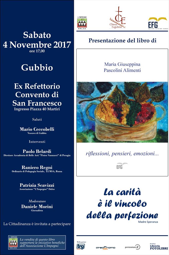 Si terrà oggi sabato 4 novembre alle ore 17 presso la sala ex Refettorio del Convento di S. Francesco, a Gubbio, la presentazione del libro di Maria Giuseppina Pascolini Alimenti, moglie del compianto giornalista Dante Alimenti, dal titolo ‘La carità è il vincolo della perfezione’, riflessioni, pensieri, emozioni, edito da ‘EFG’ Edizioni Fotolibri Gubbio. Previsti gli interventi di Paolo Belardi direttore dell’Accademia di Belle Arti di Perugia, di Raniero Regni ordinario di Pedagogia Sociale della LUMSA, di Patrizia Scavizzi dell’associazione ‘L’Impegno’ a cui saranno devolute le vendite del libro.