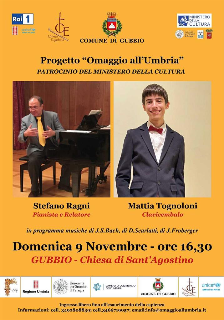 Si svolgerà domenica 9 novembre alle ore 16.30 presso la chiesa di Sant'Agostino a Gubbio, un concerto con musiche di J.S. Bach, di D.Scarlatti, di J.Froberger. Al clavicembalo Mattia Tognoloni che eseguirà alcuni brani; pianista e relatore Stefano Ragni che parlerà diffusamente degli autori delle musiche. L'iniziativa rientra nel progetto "Omaggio all'Umbria" con il patrocinio del Ministero della Cultura. Ingresso libero fino all'esaurimento della capienza.