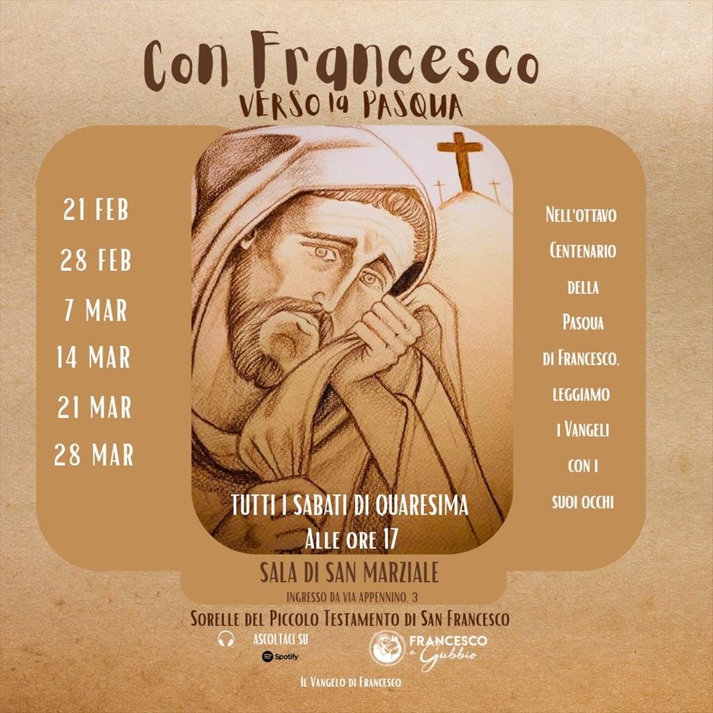Con l'inizio del cammino di Quaresima, a Gubbio, le sorelle del Piccolo Testamento di San Francesco promuovono "Con Francesco verso la Pasqua", una serie di appuntamenti che invitano ad affrontare il periodo pasquale con gli occhi di Francesco nei Vangeli delle Domeniche di Quaresima. Il primo appuntamento è fissato a sabato 21 febbraio, ore 17, nella sala di San Marziale con ingresso da via Appennino. Un pomeriggio di preghiera, di condivisione e di riflessione.