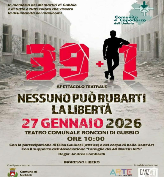 Martedì 27 gennaio alle ore 10 presso il Teatro Comunale Ronconi di Gubbio avrà luogo lo Spettacolo Teatrale “39+1NESSUNO PUÒ RUBARTI LA LIBERTÀ 27 Gennaio 2026” ideato e promosso dalla Comunità di Capodarco dell’Umbria con la partecipazione di Elisa Gallucci, Musiche di Julian Corradini, Regia di Andrea Lombardi; saranno presenti gli alunni del Polo Liceale “Mazzatinti” e IIS “Cassata-Gattapone di Gubbio”. Introduzione e Riflessioni sul Giorno della Memoria: Riccardo Sollini (Direttore Generale Capodarco dell'Umbria) e Laura Tomarelli (Presidente Associazione Famiglie dei 40 Martiri APS). Contributo Video: Proiezione del video "22 giugno 1944" a cura di Gianluca Sannipoli. Intervista ai protagonisti dello spettacolo integrato 39+1 con le collaborazioni dirette del corpo ballo della scuola di danza Danz’Art. Con il Patrocinio del Comune di Gubbio.