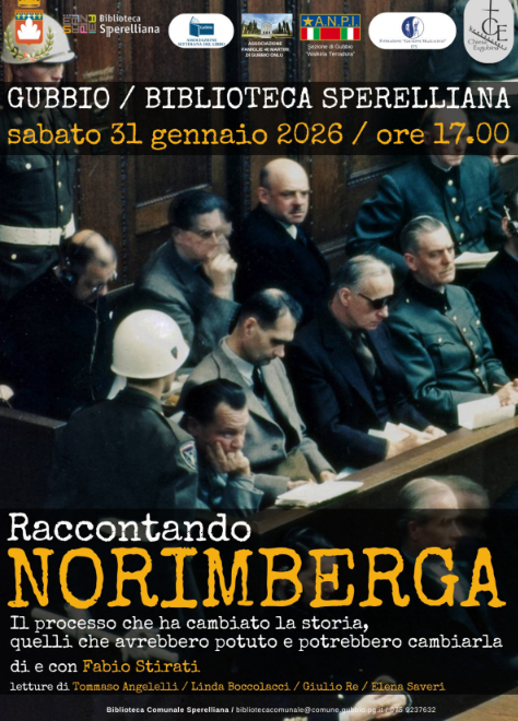 Sabato 31 gennaio alle ore 17 presso il Refettorio della Biblioteca Comunale Sperelliana avrà luogo l’incontro"RACCONTANDO NORIMBERGA”, il processo che ha cambiato la storia, quelli che avrebbero potuto e potrebbero cambiarla di e con FABIO STIRATI Letture di Tommaso Angelelli, Linda Boccolacci, Giulio Re, ElenaSaveri.