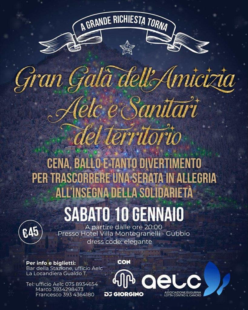 Appuntamento sabato 10 gennaio dalle ore 20 presso Villa Montegranelli di Gubbio con il "Gran Galà dell’Amicizia – Aelc e sanitari del territorio", organizzata dall’Associazione Eugubina per la Lotta contro il Cancro. Al prezzo di 45 euro sarà possibile partecipare alla cena con ballo all'insegna della solidarietà. I biglietti sono disponibili presso lo sportello Aelc all’ospedale di Branca, Bar della Stazione, La Locandiera Gualdo Tadino. La serata sarà animata da DJ Giorgino.