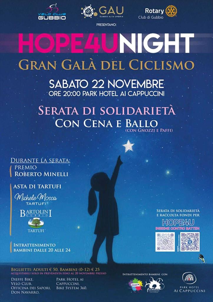 Si svolgerà sabato 22 novembre alle ore 20 al Park Hotel ai Cappuccini di Gubbio il "Gran Galà del ciclismo", serata di solidarietà con cena e ballo animata da Gnozzi e Paffi. Durante la serata il premio Roberto Minelli, Asta di tartufi e intrattenimento bambini dalle 20 alle 24. La serata vedrà la raccolta fondi per Hope4U, insieme contro Batten.