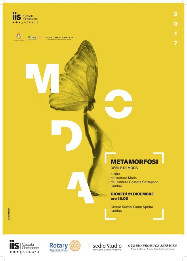 È prevista per giovedì 21 dicembre alle ore 18.00 presso gli Spazi del Centro Servizi Santo Spirito in Gubbio la sfilata di moda "Metamorfosi". L'evento, aperto al pubblico, è progettato, promosso e realizzato dalle studentesse e studenti del corso Moda dell' IIS Cassata Gattapone di Gubbio nell'ambito di un più generale progetto di riqualificazione e potenziamento del corso stesso ed è stato sviluppato in collaborazione con Confindustria-settore tessile, Rotary Club Gubbio, e aziende del settore tessile che operano nel territorio. All'evento parteciperanno con proprie realizzazioni anche altre istituzioni scolastiche della regione caratterizzate dalla presenza dell'indirizzo moda: l' IPSIA "Orfini " di Foligno, L'IPSIA "Cavour Marconi Pascal" di Perugia, l' IIS "Ciuffelli" di Todi e l' IIS di Spoleto. Negli intenti più generali infatti l'iniziativa vuole rappresentare le caratteristiche e gli esiti di competenza che l'istruzione pubblica garantisce in questo settore che apre ad interessanti ed articolate prospettive occupazionali.