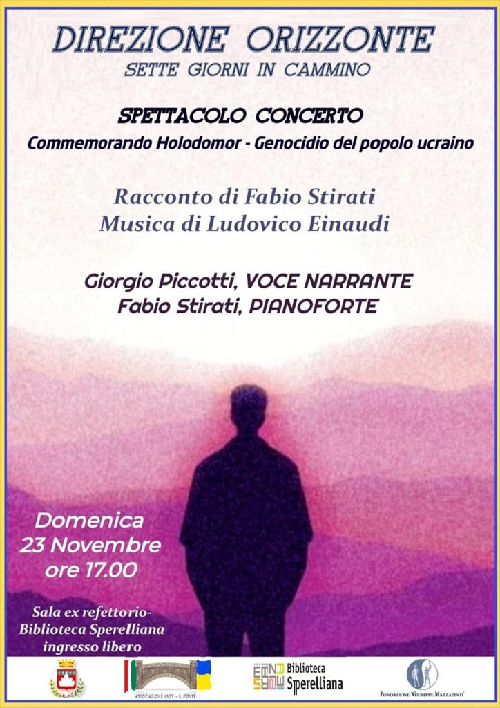 Domenica 23 novembre la Biblioteca Sperelliana di Gubbio alle ore 17 ospita uno spettacolo – concerto dal titolo “ Direzione Orizzonte, sette giorni in cammino” che vuole essere una commemorazione dell’Holodomor, la carestia voluta e perpetrata dal regime sovietico per stroncare le resistenze politiche del popolo ucraino. Il racconto è a cura del professor Fabio Stirati, interpretato da Giorgio Piccotti. Musica di Luigi Einaudi eseguita dal professor Stirati.
