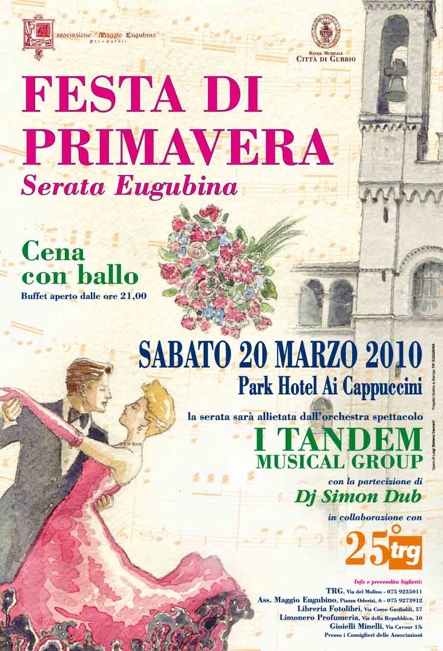 Tutto è pronto per la serata danzante di stasera, sabato 20 marzo al Park Hotel “Ai Cappuccini” di Gubbio: una serata musicale speciale in collaborazione tra TRG - che festeggia i suoi 25 anni - Associazione Maggio Eugubino e Banda Musicale Città di Gubbio: è la "Festa di Primavera - Serata Eugubina" con cena e ballo per salutare insieme l’arrivo della nuova stagione: un appuntamento danzante con buffet aperto a tutti e la musica dei Tandem e di Dj Simon Dub. La prevendita biglietti è alle ultime battute: tra i punti vendita anche la nostra redazione TRG di via del Molino a Gubbio (cena+ballo: euro 35 tutto compreso), oltre che la sede dell'Associazione "Maggio Eugubino" (piazza Oderisi) e i singoli soci, Fotolibri (corso Garibaldi), Gioielli Minelli (via Cavour).