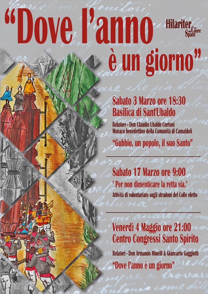 Tornano anche quest'anno gli incontri di riflessione sulla ‘Festa dei Ceri’ con gli appuntamenti di ‘Hilariter – sulle spalle, nel cuore’, nati per iniziativa di un gruppo di ceraioli di tutti e tre i Ceri, che si sono ritrovati in alcuni incontri, confrontandosi in maniera diretta, libera e spontanea su alcuni temi fondanti della Festa. Il primo appuntamento è fissato per stasera sabato 3 marzo presso la Basilica di S. Ubaldo, alle 18.30 e interverrà don Claudio Ubaldo Cortoni, monaco benedettino della Comunità di Camaldoli, con un approfondimento dal titolo "Gubbio: un popolo e il suo santo".