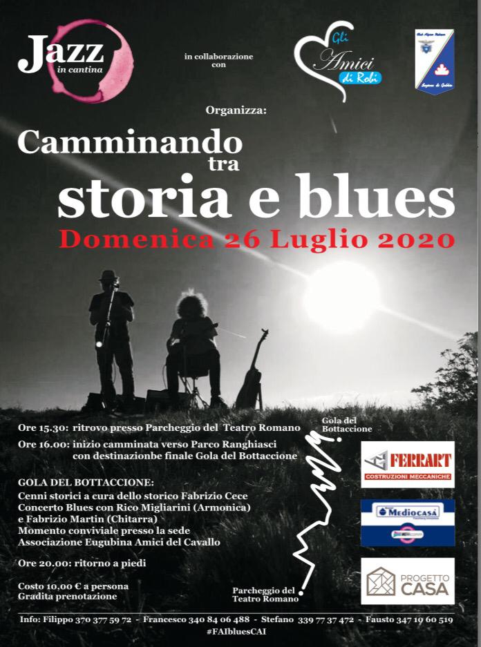 Dopo la prima edizione del 2018 al Castello di Colmollaro e quella dello scorso anno alla Rocca di S. Ubaldo si terrà domenica 26 luglio, la terza edizione di “Camminando tra storia e blues”, l'iniziativa organizzata da "Jazz in cantina" in collaborazione con il Cai di Gubbio e l'associazione 'Amici di Robi', con l'obiettivo di portare della buona musica in luoghi poco frequentati.L'iscrizione, si terrà alle ore 15.30 presso il Teatro Romano, per poi partire alle ore 16:00 in direzione Gola del Bottaccione, passando per il sentiero dei "Sette Camini". I partecipanti coniugheranno l'aspetto motorio a quello storico e saranno accolti dallo storico Fabrizio Cece che illustrerà storicamente il luogo e allietati dal concerto blues con Riccardo Migliarini alle armoniche e Fabrizio Martin alla chitarre. Intorno alle 19 l'evento si concluderà con un momento conviviale presso l' Associazione Eugubina "Amici del Cavallo".