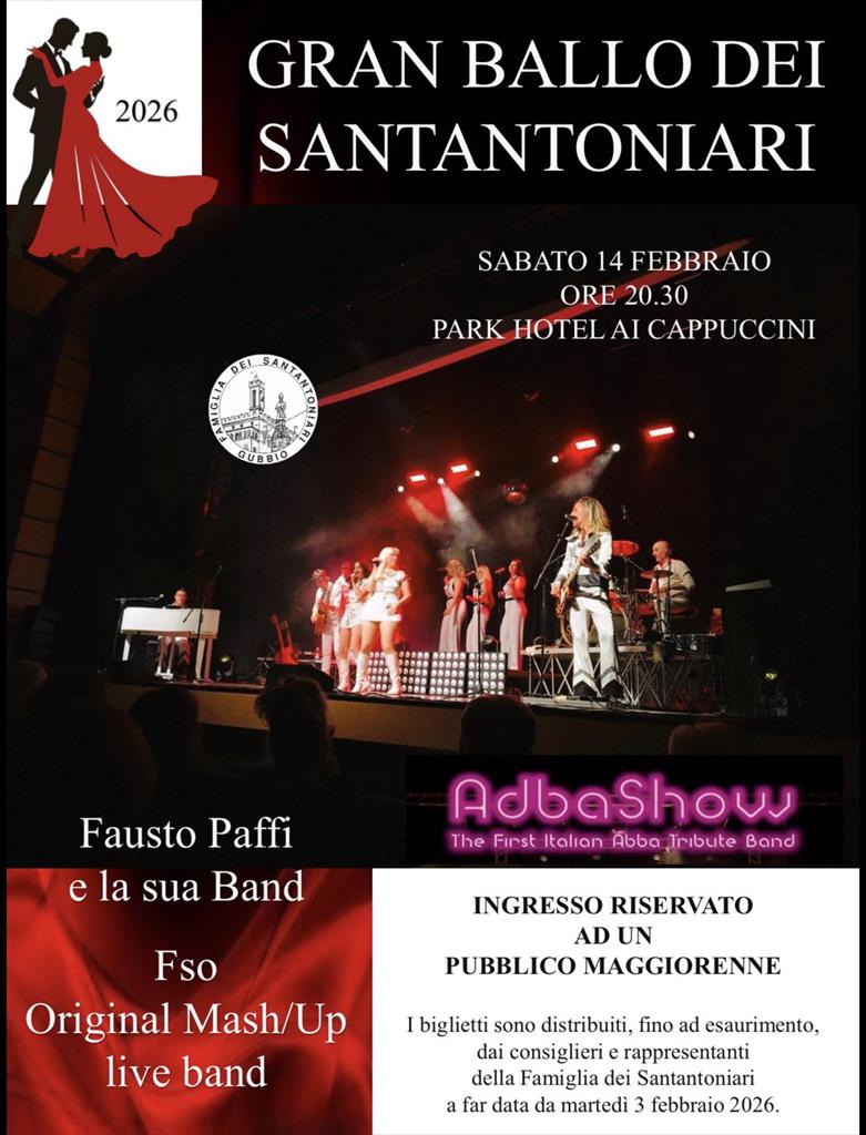 Sabato 14 febbraio ore 20.30 al Park Hotel Ai Cappuccini Gran Ballo dei Santantoniari, ultima delle serate di festa legate alla tradizione dei Vejoni Ceraioli. Sarà Fausto e la sua Band e la FSO Original Mash/Up live band a ravvivare la serata danzante, nella quale non mancheranno le sorprese e il clima di festa ceraiolo. Ospiti d'eccezione Abbashow – The First Italian Abba Tribute Band. Previsto il passaggio di consegne tra i capodieci, Mattia Martinelli che ha guidato il cero nel 2025 e Alessandro Lepri che lo guiderà nel 2026 e l’elezione della Santantoniara 2026. L'ingresso è riservato ad un pubblico maggiorenne. I biglietti sono distribuiti, fino ad esaurimento, dai consiglieri e rappresenranti della Famiglia dei Santantoniari da martedì 3 febbraio 2026.