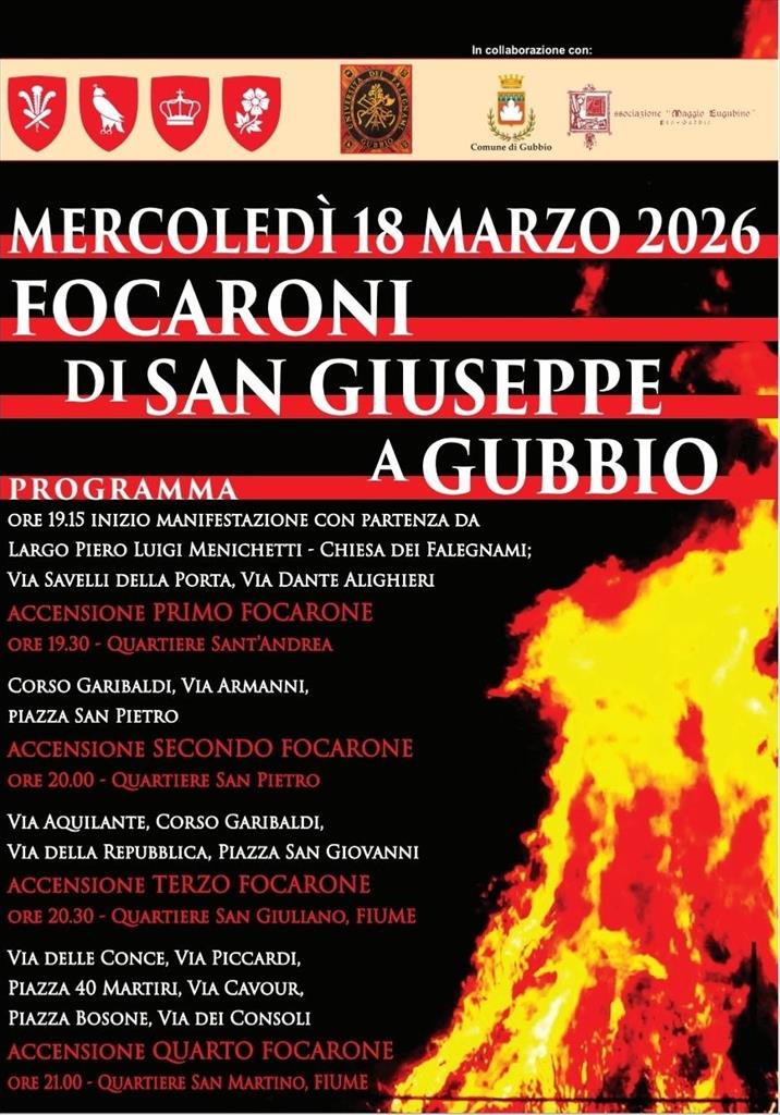 Tornano, mercoledì 18 marzo a Gubbio, i 'Focaroni' alla vigilia della festa di San Giuseppe. Un suggestivo itinerario per le vie del centro storico per rievocare l'antica tradizione: alle ore 19.15 l'inizio della manifestazione con partenza da Largo Luigi Menichetti - Chiesa dei Falegnami; via Savelli della Porta, via Dante Alighieri. Alle ore 19.30 accensione del Focarone di Sant'Andrea, quindi a seguire ore 20 San Pietro, ore 20.30 San Giuliano, ore 21 San Martino. Giovedì 19 marzo, invece storica ricorrenza per i Soci dell’Università e i loro dipendenti: si festeggerà come da tradizione eugubina il Santo Patrono dei falegnami Giuseppe con una Santa Messa che verrà celebrata presso la chiesa di San Giuseppe alle ore 11.30 e con il consueto raduno conviviale. Seguirà il pomeriggio di festa presso i locali della sede in Via Savelli della porta.
