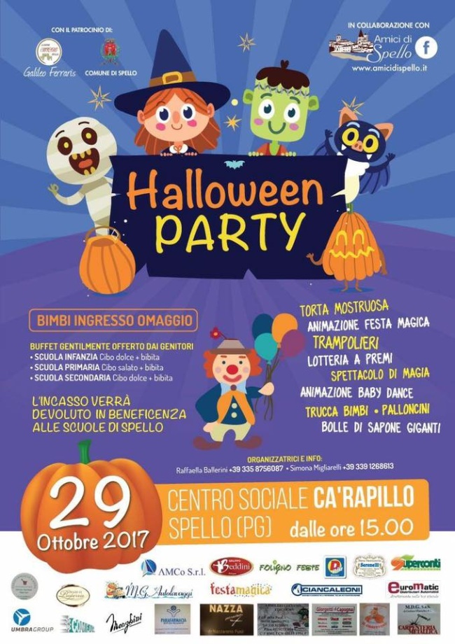 Dolcetto o scherzetto? Meglio l'Halloween School Party a Spello! La Splendidissima Colonia Iulia rinnova l’appuntamento ormai consolidato da qualche anno - grazie all’impegno di alcuni genitori, rafforzato quest'anno dalla collaborazione con l'associazione 'Amici di Spello' - con la festa di Halloween che si terrà domenica 29 ottobre al centro sociale Ca Rapillo a partire dalle 15.30. Un evento che come in ogni passata edizione richiamerà centinaia di bambini e ragazzi insieme alle loro famiglie per trascorrere un pomeriggio in allegria. Bambini e adolescenti (dalle scuole dell’infanzia fino alla scuola secondaria) si ritroveranno al Centro Sociale Ca Rapillo e con un piccolo contributo dei genitori (5€ adulto+cibo+bibita; 10€ adulto senza cibo) si farà festa, destinando l’incasso alle scuole di Spello. Per i bimbi l’ingresso sarà gratuito! La merenda a buffet offerta dai genitori sarà accompagnata da una torta ‘mostruosa’. Animazione tutto il pomeriggio per i bambini con la ‘Festa magica’ e uno spettacolo di magia loro dedicato. Immancabili la baby dance, il trucca bimbi, palloncini e bolle di sapone giganti per un pomeriggio speciale! Previste anche una lotteria a premi a scopo benefico e tante altre sorprese.