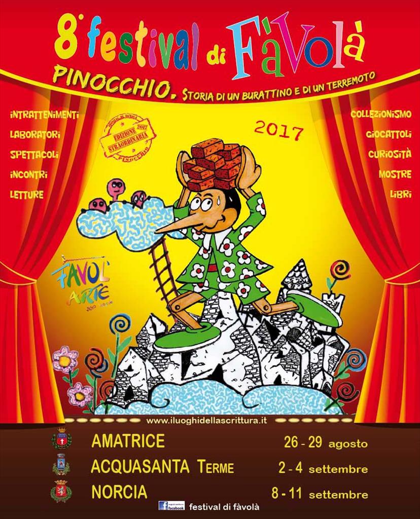 La magia di Pinocchio che ha suggellato il grande successo ottenuto ad Amatrice e ad Acquasanta Terme, porterà il “Festival di Fàvolà” alla sua ultima tappa: Norcia dall’ 8 all’ 11 settembre. Dopo il grande stupore suscitato dalla mostra “Pinocchio. Storia di un burattino e di un terremoto” che ha accompagnato la kermesse itinerante, riscuotendo enormi consensi per la qualità e l’originalità del prezioso materiale da collezione esposto e per le opere di FAVOL’ARTE, a Norcia appuntamento imperdibile, dove oltre alle consuete attività di laboratori, degustazioni. spettacoli e creatività, ci sarà l’incontro con Andrea Balestri, l’atteso ospite della mattina di domenica, che ci porterà indietro nel tempo, raccontandoci aneddoti ed emozioni del suo personale Pinocchio, essendo stato il protagonista, insieme al compianto Nino Manfredi, del famoso film di Luigi Comencini “Le avventure di Pinocchio”. Lunedì pomeriggio invece sarà Silvia Jacovitti a concludere in bellezza il festival nel ricordo del padre Benito, uno dei più grandi illustratori del XX secolo, di cui ricorre l’anniversario della scomparsa. A lui è dedicata una parte della mostra con i meravigliosi pannelli dipinti dall’artista abruzzese Giancarlo Bucci. Il Festival sarà ospitato nei locali della Scuola Primaria di Norcia, in via dell’Ospedale.