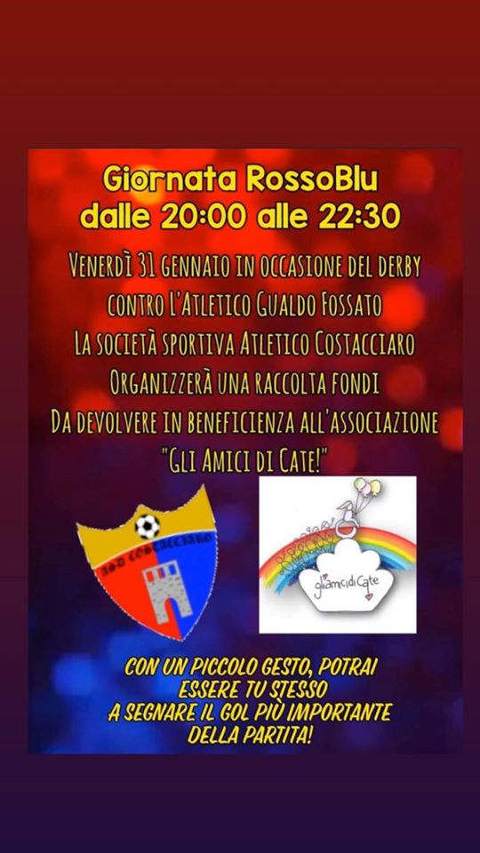 Proseguono le iniziative di solidarieta' a sostegno di Caterina, la bimba eugubina affetta da una grave malattia neurologica e bisognosa di cure importanti. Domani venerdì 31 gennaio, dalle 20 alle 22,30, Giornata Rossoblu: in occasione del derby contro l'atletico Gualdo Fossato, la società sportiva atletico Costacciaro organizzerà una raccolta fondi da devolvere in beneficienza all'associazione "Gli Amici Di Cate". Info sulla pagina Facebook dell'associazione.