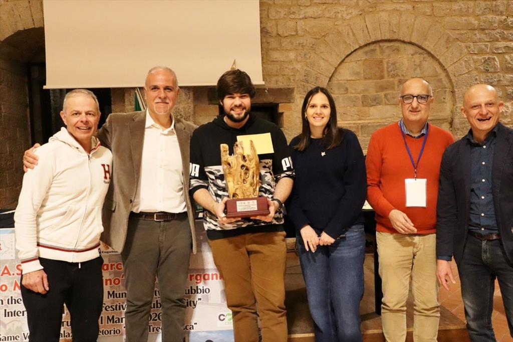 Gubbio si conferma sempre più un punto di riferimento nel panorama scacchistico italiano grazie al Festival Internazionale di Scacchi “Città di Gubbio”, che nel fine settimana dal 27 febbraio al 1° marzo ha richiamato 170 giocatori da tutta Italia e dall’estero nelle splendide sale Trecentesca e Consiliare di Palazzo Pretorio. La manifestazione, giunta alla quarta edizione, conferma un trend di crescita costante sia nel numero dei partecipanti sia nella qualità tecnica del torneo. L’evento è stato organizzato grazie alla collaborazione tra lo scacchista e organizzatore siciliano Giuseppe Zangla e l’Associazione Gruppo Scacco Matto Eugubino, presieduta da Francesco Zaccagni, con il patrocinio e il contributo dell’Amministrazione Comunale di Gubbio. Zangla ha individuato nella città di Gubbio il luogo ideale per ospitare una manifestazione scacchistica di rilievo, grazie alla bellezza del centro storico, alla posizione geografica centrale e soprattutto alla suggestiva Sala Trecentesca di Palazzo Pretorio, che si conferma una cornice di grande fascino per eventi di questo livello. A Gubbio sono arrivati giocatori di ogni età e livello, provenienti da tutte le regioni italiane e i rappresentanza di 9 paesi esteri: Germania, Belgio, Francia, Cipro, Israele, Moldova, Paesi Bassi, Ucraina e San Marino. Parliamo di scacchisti che hanno viaggiato appositamente per partecipare alla competizione, segno della crescente risonanza che il torneo sta acquisendo nel circuito internazionale. Il torneo si è svolto nell’arco dell’intero weekend su 5 turni di gioco da 90 minuti a giocatore ed è stato suddiviso in quattro Open (A-B-C-D), organizzati in base al punteggio Elo (cioè la forza di gioco), per garantire partite equilibrate e avvincenti tra giocatori di pari livello. Tra i giocatori più forti (Open A, Elo superiore a 1900) la vittoria è andata a uno dei favoriti della vigilia, il Maestro Internazionale moldavo Ilia Martinovici, che ha preceduto due maestri romani, Marco Ferrante (2°) e Marco Corvi (3°).