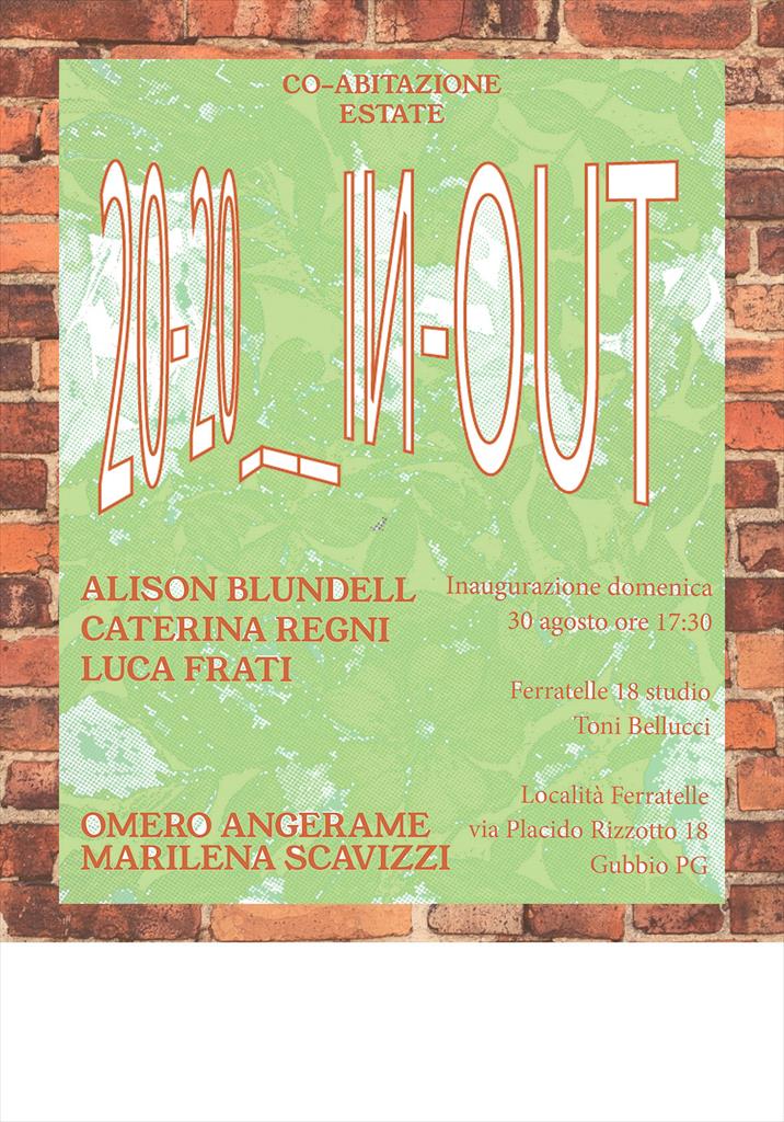 20 - 20, In Out. Al giardino di Toni Bellucci in località Ferratelle a Gubbio ( via Rizzotto 18 ) saranno in mostra domenica 30 agosto a partire dalle ore 17.30 le opere di Alison Blundell, artista-insegnante, di Caterina Regni e Luca Frati. In questa occasione Marilena Scavizzi presenta il “Teatro dei Burattini”; piccoli attori di pezza, con voci prestate (Simona Minelli, Giuliano Traversini, Patrizia Scavizzi), che racconteranno le favole di Esopo. Omero Angerame presenta una cartella con opere realizzate durante il lockdown.
