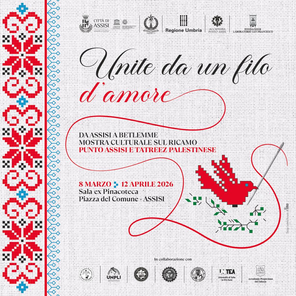 Assisi, Betlemme e la Palestina unite dall'arte del ricamo fatto a mano, con una mostra fra cultura, tradizione e solidarietà, in programma nella città serafica dall'8 marzo al 12 aprile 2026, nel segno della pace e della speranza. Cuore del progetto sono il "Punto Assisi" e il "Tatreez", tecniche tradizionali di ricamo portate avanti da secoli tanto nella terra di San Francesco quanto in quella palestinese. Ad unirle è il cosiddetto punto croce su cui entrambe si basano, oltre alla passione di tante ricamatrici, che con ago e filo creano vere e proprie opere d'arte, come quelle che saranno in esposizione nella Sala ex Pinacoteca, in piazza del Comune. Una mostra unica, intitolata "Unite da un filo d'amore", con decine di pezzi fra complementi di arredo e abiti unici nel loro genere, provenienti da Assisi, dalla città gemellata Betlemme e da vari territori della Palestina, prestati da privati e dalla "Rete Radiè Resch". L'iniziativa è promossa da Comune di Assisi con il Comune di Betlemme, Regione Umbria, Accademia Punto Assisi e Fondazione Laboratorio di San Francesco, in collaborazione con Cammino francescano di qui passò Francesco... Con le ali ai piedi, Unpli Umbria, Pro Loco Assisi, Società Culturale Arnaldo Fortini, Calendimaggio Assisi, Università di Tutte le Età Assisi, Accademia Properziana del Subasio. L'idea - spiega il Comune - è quella di porre a confronto le due tecniche di ricamo, che utilizzano il punto croce in modo diverso ma con la stessa forza e bellezza. Il Tatreez ha una storia millenaria ed è patrimonio immateriale Unesco; il Punto Assisi è uno dei pochi che porta il nome della città in cui è nato e viene ricamato, una sorta di Dop del ricamo. Nell'ottavo centenario della morte di San Francesco, l'iniziativa è anche un modo per promuovere valori come dialogo e integrazione fra culture diverse, per costruire gesti di pace e speranza in questo momento storico difficile. L'inaugurazione è in programma domenica 8 marzo, alle ore 11.00, nella Sala ex Pinacoteca, in piazza del Comune, presenti il sindaco di Assisi, Valter Stoppini, la presidente della Regione Umbria Stefania Proietti, e la politica e attivista Luisa Morgantini. Sarà possibile visitare la mostra, con ingresso libero, tutti i giorni fino al 12 aprile prossimo, dalle ore 10.00 alle 13.00 e dalle 14.30 alle 19.00. Sono previsti diversi eventi collegati alla stessa, con conferenze, workshop di ricamo, presentazioni di libri, concerti. Il 7 marzo, alle 17.00 in Sala della Conciliazione, conferenza di apertura "Betlemme fra cielo e terra, storia di fede, pellegrini e poteri nel Medioevo", a cura del professor Antonio Musarra. Il 14 marzo, dalle 9.30 alle 12.30 e dalle 14.30 alle 17.00, in sala ex Pinacoteca, workshop di ricamo "Tecnica e storia del ricamo palestinese e assisano", a cura di Jasmine e Michelle Sit Abohae, in collaborazione con Accademia Punto Assisi (gratuito, con prenotazione obbligatoria: 349 1283610). Nella stessa sala, alle 17.30, conferenza "L'identità e la storia del popolo palestinese nell'arte del ricamo. Il Tatreez: tradizione e similitudini con il punto croce assisano", a cura di Jasmine e Sit Abohae e Tiziana Borsellini, presidente Accademia Punto Assisi. Il 15 marzo, dalle 9.30 alle 11.30, sempre in sala ex Pinacoteca, workshop di ricamo "Tecnica e storia del ricamo palestinese e assisano", a cura di Jasmine e Michelle Sit Abohae, in collaborazione con Accademia Punto Assisi (gratuito, con prenotazione obbligatoria: 349 1283610). Alle 11.30 si terrà conferenza "Trame di libertà: come il ricamo ha cucito l'autonomia delle donne, a cura della professoressa Glenda Giampaoli. Il 20 marzo, alle 17.00, in sala della Conciliazione, presentazione del libro "Il mondo secondo Francesco d'Assisi", a cura del professor Antonio Musarra. Interviene fra Sergio Lorenzini. Il 22 marzo, alle 17.00, in sala della Conciliazione, concerto-conferenza "Uniti da un filo di musica. Storia e legame fra l'Oud palestinese e il Liuto occidentale", a cura di Luca Piccioni (Liuto) e Danilo Tamburo (Oud). Il 28 marzo, alle 17.00 in Sala della Conciliazione, conferenza "Francesco d'Assisi e le donne: Chiara, Jacopa e le altre", a cura della professoressa Chiara Mercuri.