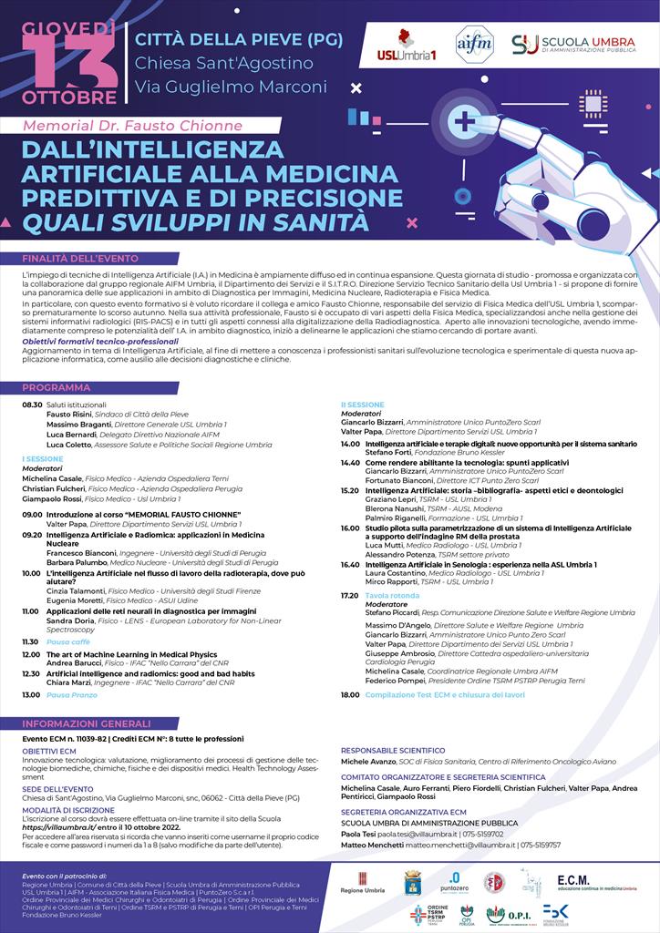 "Dall'Intelligenza artificiale alla medicina predittiva e di precisione quali sviluppi in sanità": è questo il titolo del grande evento formativo in programma giovedì 13 ottobre nella Chiesa Sant'Agostino di Città della Pieve (ore 8,30-18), nato dalla collaborazione tra il gruppo regionale Aifm (Associazione Italiana Fisica Medica) Umbria, il dipartimento dei Servizi e del SITRO direzione Servizio tecnico sanitario dell'Usl Umbria 1 e la Scuola Umbra di amministrazione pubblica. L'iniziativa è stata dedicata al dottor Fausto Chionne, a un anno dalla sua prematura scomparsa, per condividere e approfondire le applicazioni dell'intelligenza artificiale in ambito medico e diagnostico che lui stesso aveva fin da subito intuito e iniziato a delineare. L’impiego di tecniche di Intelligenza artificiale in medicina è ampiamente diffuso ed in continua espansione. Questa giornata di studio si propone di fornire una panoramica delle sue applicazioni in ambito di Diagnostica per Immagini, Medicina Nucleare, Radioterapia e Fisica Medica. In particolare, con questo evento formativo si è voluto ricordare il collega Fausto Chionne, responsabile del servizio di Fisica Medica dell’Usl Umbria 1, scomparso prematuramente lo scorso autunno. Nella sua attività professionale, il dottor Chionne si è occupato di vari aspetti della Fisica Medica, specializzandosi anche nella gestione dei sistemi informativi radiologici (Ris-Pacs) e in tutti gli aspetti connessi alla digitalizzazione della Radiodiagnostica. Aperto alle innovazioni tecnologiche, avendo immediatamente compreso le potenzialità dell’Intelligenza artificiale in ambito diagnostico, iniziò a delinearne le applicazioni che si sta cercando di portare avanti. Gli obiettivi formativi e tecnico-professionali del convegno – il cui responsabile scientifico è Michele Avanzo, Soc di Fisica Sanitaria, Centro di Riferimento Oncologico Aviano (Pn) - sono quelli di mettere a conoscenza i professionisti sanitari sull’evoluzione tecnologica e sperimentale di questa nuova applicazione informatica, come prezioso ausilio alle decisioni diagnostiche e cliniche. L’evento ha il patrocinio di: Regione Umbria, Comune di Città della Pieve, Scuola Umbra di Amministrazione Pubblica, Usl Umbria 1, Aifm - Associazione Italiana Fisica Medica, PuntoZero Scarl, Ordine Provinciale dei Medici Chirurghi e Odontoiatri di Perugia, Ordine Provinciale dei Medici Chirurghi e Odontoiatri di Terni, Ordine Tsrm e Pstrp di Perugia e Terni, Opi Perugia e Terni e Fondazione Bruno Kessler. Il comitato organizzatore e la segreteria del convegno sono composti da Michelina Casale, Auro Ferranti, Piero Fiordelli, Christian Fulcheri, Valter Papa, Andrea Pentiricci e Giampaolo Rossi. La partecipazione all’evento assegnerà 8 crediti formativi ECM a tutte le professioni.
