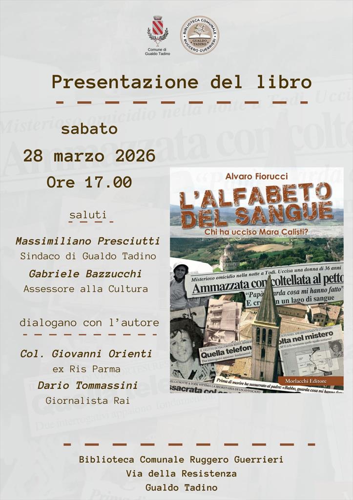L’Amministrazione Comunale di Gualdo Tadino ospita sabato 28 marzo alle ore 17.00, presso la Biblioteca Comunale Ruggero Guerrieri, un appuntamento dedicato all'approfondimento della cronaca nera e della ricerca della verità. L’iniziativa vede la presentazione dell’ultimo libro del giornalista Alvaro Fiorucci, intitolato "L’alfabeto del sangue. Chi ha ucciso Mara Calisti?", pubblicato da Morlacchi Editore. Il volume analizza uno dei misteri più complessi del panorama giudiziario umbro, ovvero l'omicidio della giovane donna avvenuto a Todi il 15 luglio 1993, un delitto che a distanza di oltre trent'anni resta ancora privo di un colpevole. L’evento sarà aperto dai saluti istituzionali di Massimiliano Presciutti, Sindaco di Gualdo Tadino e Presidente della Provincia di Perugia, e dell’Assessore alla Cultura Gabriele Bazzucchi. Seguirà un dibattito tecnico e giornalistico di alto profilo in cui l’autore si confronterà con il Colonnello Giovanni Orienti, già in forza al RIS di Parma, e con il giornalista Rai Dario Tomassini. Il confronto permetterà di esaminare le tecniche investigative dell’epoca mettendole in relazione con le moderne tecnologie forensi, offrendo una prospettiva scientifica su come la gestione dei reperti sia cambiata nel corso dei decenni. In merito all'importanza dell'evento, il Sindaco Massimiliano Presciutti ha dichiarato che "il dovere di una comunità è quello di non dimenticare, poiché la ricerca della giustizia resta un pilastro fondamentale del vivere civile, specialmente di fronte a ferite che il tempo non è riuscito a rimarginare completamente". L’opera di Alvaro Fiorucci, edita da Morlacchi, si muove tra le pieghe di una realtà che supera ogni artificio narrativo, ricostruendo con rigore documentale una notte che sconvolse la quiete di una cittadina all'epoca simbolo di massima vivibilità. Il saggio ripercorre le indagini, i sospetti e i processi che non sono riusciti a dare un nome all'assassino. Alvaro Fiorucci, già caporedattore del TGR Umbria e profondo conoscitore delle dinamiche criminali italiane, consegna ai lettori una riflessione necessaria sull'efficacia del sistema giudiziario e sulla persistenza di un dolore che attende ancora giustizia.