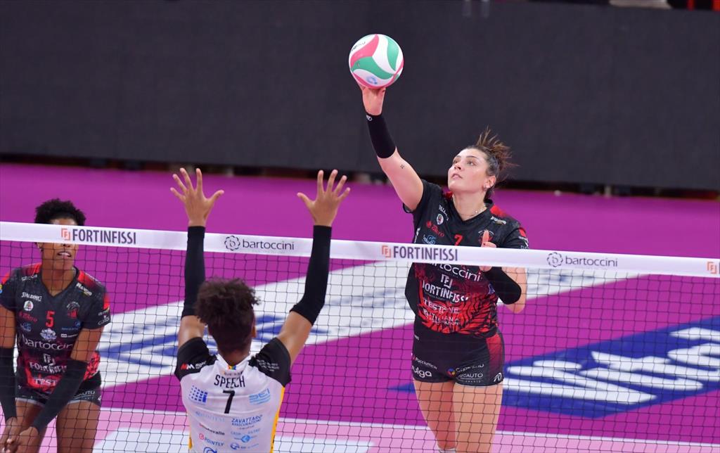 La Bartoccini Fortinfissi Perugia conquista la prima vittoria stagionale vincendo 3-0, 25-22, 25-22, 25-23 i parziali, contro la Banca Valsabbina Millenium Brescia. L’inizio è equilibrato, poi la Bartoccini Fortinfissi Perugia allunga e si porta sul +3 (7-4) ed allora coach Mazzola ferma il gioco, la pausa non sortisce l’effetto sperato, Perugia allunga sull'11-6 con un attacco di Angeloni e Brescia ferma nuova nuovamente il gioco. Questa volta la sosta fa bene alle ospiti che dimezzano lo svantaggio, allora è Bovari a chiamare time out, il gap si assottiglia pian piano fino a trovare la parità suò 16-16. Montibeller trascina Perugia, ma Brescia resta in scia con Speech, 21-20, il finale è concitato ed il colpo vincente è della squadra di casa che chiude con il mani out di Montibeller 25-22. Nel secondo set è Perugia a partire meglio, in avvio va subito 5-2. Le ospiti reagiscono ed il risultato torna in parità con Speech che sigla il 7-7, le ragazze di Bovari ritornano a macinare e si portano in vantaggio nuovamente sull’11-9, costringendo Mazzola a fermare il gioco, la pausa è provvidenziale e Brescia raggiunge la parità12-12 con Segura. Ancora una volta Montibeller si carica sulle spalle le sorti della squadra e Perugia trova il break dell'allungo, la Millenium rientra in gara con il mani out di Mingardi su Casillo che riporta il risultato in parità sul 21-21. L’allungo finale è tutto per la Bartoccini Fortinfissi Perugia, che con un muro conquista il punto che termina il set sul 25-22. Il terzo parziale parte con il piglio giusto per le ospiti, l’ace di Mingardi sigla l’1-4, Perugia si riprende e impatta il punteggio portandosi poi in vantaggio sul 7-5. Mazzola ferma il tempo e Brescia ricuce il divario, con Mingardi, 7-7. Angeloni e compagne allungano di nuovo ed il punto del 15-10 arriva con un attacco di Casillo. Mingardi è corsara e Brescia rientra nel set accorciando il divario a due sole lunghezze. Le Leonesse con gli artigli provano a rientrare in gara e ci riescono con con il muro di Speech che sigla il 22-22. Oggi però “Santa Rosa” Montibeller è dilagante e trascina le sue compagne fino al match point, Brescia annulla il primo ma l’attacco out di Mingardi regala la prima vittoria alla Bartoccini Fortinfissi Perugia.