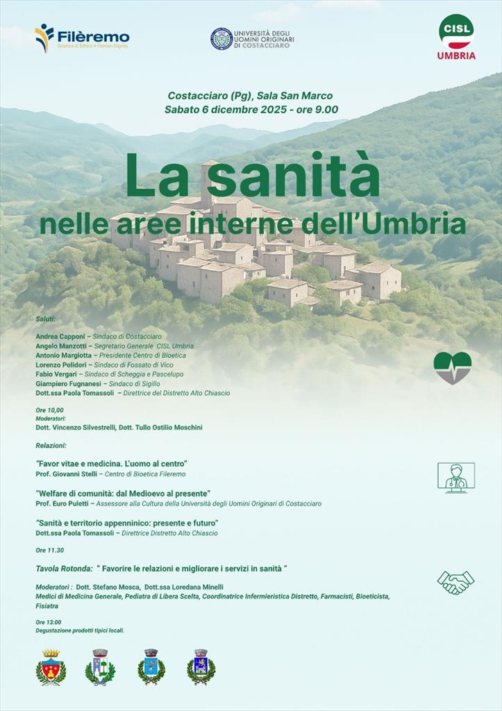 Si è svolto nei giorni scorsi a Costacciaro un convegno-seminario sul tema della sanità nelle aree interne dell’Umbria,organizzato dalla CISL Umbria, dal centro di bioetica Fileremo e dalla Università degli uomini originari di Costacciaro con l’obiettivo di riflettere sulla sanità, partendo dalla esperienza delle aree interne. Dopo i saluti istituzionali dei sindaci di Costacciaro, Andrea Capponi, di Scheggia, Fabio Vergari, di Sigillo, Giampiero Fugnanesi e di Fossato di Vico, Lorenzo Polidori, del presidente del Fileremo Antonio Margiotta, è intervenuto Angelo Manzotti, segretario generale regionale della CISL Umbria che ha sottolineato l’importanza delle aree montane della regione, nelle quali vivono circa 200 mila umbri. “Il seminario – ha sottolineato Manzotti - è stato concepito dalla CISL Umbria per avere un necessario confronto in una fase di elaborazione del piano regionale socio - sanitario in modo da essere consapevoli delle esigenze delle popolazioni residenti nelle aree interne. I problemi di desertificazione, per altro – prosegue il segretario -, non riguardano solo la sanità, ma anche la scuola, i trasporti, le banche e il commercio. Per la Cisl Umbria il modello da attuare è quello della sanità territoriale, tenendo conto anche dell’indice di invecchiamento, particolarmente elevato in Umbria. Case di comunità, assistenza domiciliare e telemedicina, sono alcune delle risposte tecniche che si possono dare”. Nell’avviare gli interventi dei relatori presenti, il dott. Tullio Ostilio Moschini, coordinatore delle politiche socio – sanitarie della Cisl Umbria ha proposto di avviare un tavolo di lavoro sui temi evidenziati dai sindaci e dai relatori. Tutti gli intervenuti hanno segnalato l’importanza della sanità legata al territorio e della fondamentale relazione personale fra medico e malato. In particolare Euro Puletti, della Università degli uomini originari di Costacciaro, ha ricordato di come la realtà che rappresenta si facesse carico, fin dal Medioevo, della cura di abitanti del Castello e dei pellegrini attraverso un ospedale e un medico che veniva sostenuto dalla comunità. Questa esperienza è un esempio storico di sanità territoriale che potrebbe ispirare anche il futuro. E’ emersa poi la capacità delle comunità locali a intervenire sulle problematiche sanitarie, mettendo in rete le risorse collettive di cui dispongono. “L’incontro quindi – ha ribadito Manzotti a margine dell’evento - è stato l’inizio di una collaborazione volta a migliorare, in sede di contrattazione, il Piano socio - sanitario regionale in corso di redazione”. Sono intervenuti come relatori il prof. Giovanni Stelli del Centro di Bioetica Fileremo, il già ricordato prof. Euro Puletti e la dottoressa Paola Tomassoli, direttrice del Distretto Alto Chiascio. Hanno partecipato alla tavola rotonda, secondo momento del seminario e moderata dal dott. Stefano Mosca e dalla dott.sa Loredana Minelli, il dott. Stefano Ambrogi, medico generale, il dott. Fabio Ermili, bioeticista e chirurgo, il dott. Bruno Lepri, fisiatra, il dott. Stefano Lucentini, pediatra e la dott.ssa Cinzia Venturi, responsabile del servizio infermieristico del distretto.