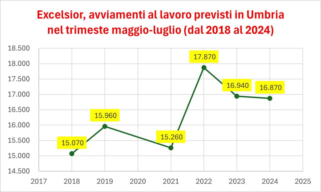Giorgio Mencaroni, Presidente Camera di Commercio dell’Umbria: “Il trimestre maggio-giugno 2024 per l’Umbria si divide in due fasi a livello di avviamenti al lavoro, così come emergono dal Sistema informativo Excelsior sulle previsioni di assunzione da parte delle imprese: la prima fase è di ulteriore e consistente espansione, rispetto al 2023, che caratterizza il mese di maggio, mentre per i mesi di giugno e luglio, sempre nel confronto con gli stessi mesi dello scorso anno, si stima un leggero calo. Ma i dati di giugno e soprattutto luglio sono caratterizzati dagli avviamenti nel settore del turismo ed è ancora presto per avere un quadro previsionale sull’andamento del mercato turistico regionale. Di conseguenza gli operatori sono prudenti nell’indicare gli avviamenti che intendono effettuare. Questo per dire che, a consuntivo, l’andamento occupazionale a giugno e luglio potrebbe essere migliore di quanto sia previsto oggi. Per il resto, c’è da salutare il ritorno al segno più dell’industria, con la crescita occupazionale concentrata nelle costruzioni, mentre restano sul tappeto i problemi strutturali della difficoltà delle imprese dell’Umbria a reperire le professionalità di cui hanno bisogno e la bassa percentuale di laureati sul totale delle assunzioni previste. Una percentuale, quest’ultima, che continua ad essere ben sotto il dato medio nazionale”.