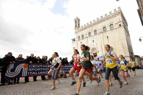 Si danno la mano al cambio sotto lo sguardo del Campanone famoso in tutto il mondo per scandire il ritmo della Festa dei Ceri. La manifestazione umbra si è chiusa con l’esibizione dei celeberrimi Sbandieratori di Gubbio che per l’occasione hanno lanciato al cielo, in segno di amicizia con il CSI, la bandiera arancioblu dell’associazione sportiva di ispirazione cristiana e con le premiazioni delle migliori società. La classifica generale, che somma i punteggi delle migliori 7 categorie per squadra ha visto il successo della Pol. Dueville Vicenza, per la felicità del responsabile tecnico del settore atletica della polisportiva, Gianni Faccin. “A Gubbio abbiamo celebrato degnamente la nostra decima partecipazione al GP nazionale Csi – ha detto soddisfatto il dirigente vicentino – da cinque anni esiste la classifica generale e ci mancava in bacheca il primo posto in questa specialissima graduatoria”. I berici hanno messo dietro di loro due fra gli storici sodalizi lariani del cross ciessino, e cioé le due lecchesi Cortenova seconda e Virtus Calco terza.