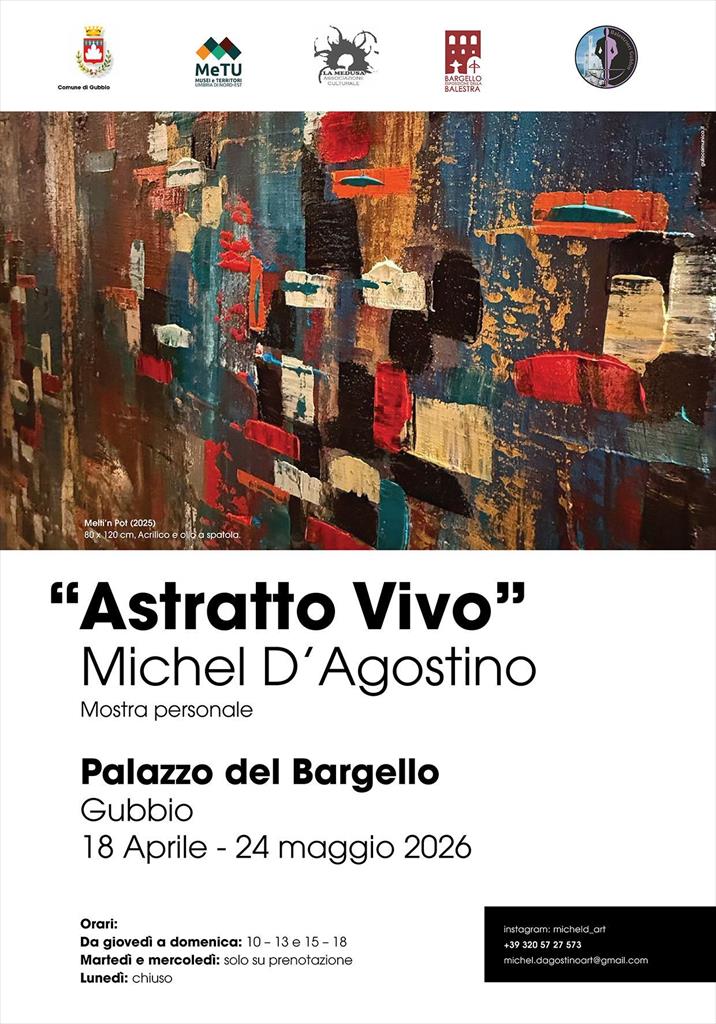 Si inaugura domani sabato 18 aprile a Palazzo del Bargello di Gubbio la mostra "Astratto Vivo" di Michel D'Agostino. Nato in Svizzera, sviluppa fin da giovane un forte legame con la natura e la dimensione materica del paesaggio, elementi che diventeranno centrali nella sua ricerca artistica. La sua formazione attraversa ambiti diversi — arte, scenografia, restauro, pittura e scultura — dando vita a una pratica in cui visione artistica e sapere artigianale si fondono. Oggi la sua attività si configura come un dialogo continuo tra intervento sulla materia e costruzione dell’immagine. La sua poetica si radica nell’arte astratta, intesa come origine della forma. Lavora il colore fresco su fresco, utilizzando esclusivamente spatole di diverse dimensioni: una scelta tecnica che definisce una pittura fisica, stratificata, dove la superficie si costruisce per accumulo, diventando quasi scultura. Le sue opere sono campi energetici dominati da forti contrasti cromatici — rossi, ori e blu — in cui talvolta emergono figure umane essenziali, prive di identità, come apparizioni generate dalla stessa materia pittorica. La sua ricerca indaga il rapporto tra materia, memoria e forma, dando vita a un linguaggio che non rappresenta, ma rivela. Mostra promossa da Associazione Culturale La Medusa con il Patrocinio del Comune di Gubbio e Società Balestrieri di Gubbio.