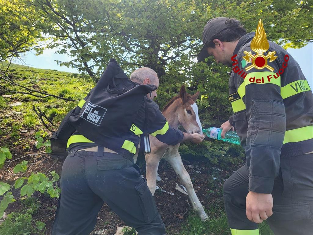 Giunti sul posto, l'animale in questione era un puledro rimasto bloccato in un pendio. Dopo essere stato reidratato, è stato lentamente riaccompagnato dalla madre che con il branco stava pascolando poco sotto.