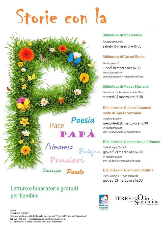 Sarà dedicato alle “Storie con la P” il prossimo tema di “Nati per leggere”, il progetto educativo finalizzato ad accrescere lo sviluppo affettivo e culturale dei bambini. L’appuntamento è sabato 16 marzo alle 16.30 nella biblioteca comunale nel palazzo comunale e prevede letture e laboratori gratuiti per bambini che girano intorno alle lettera “P”, come poesia, pace, papà, primavera, Pasqua, pensieri, paesaggi e parole. Da alcuni anni il Comune di Montefalco aderisce al progetto “Nati per leggere” e “Nati per la Musica” che hanno come base l’alleanza tra pediatri, operatori sanitari, musicisti, bibliotecari e figure professionali diverse a supporto dell’integrazione e della promozione del benessere del bambino e della famiglia. L’iniziativa è organizzata dalle biblioteche dell’Unione dei Comuni “Terre dell’Olio e del Sagrantino”, da Sistema Museo e dal Comune di Montefalco.