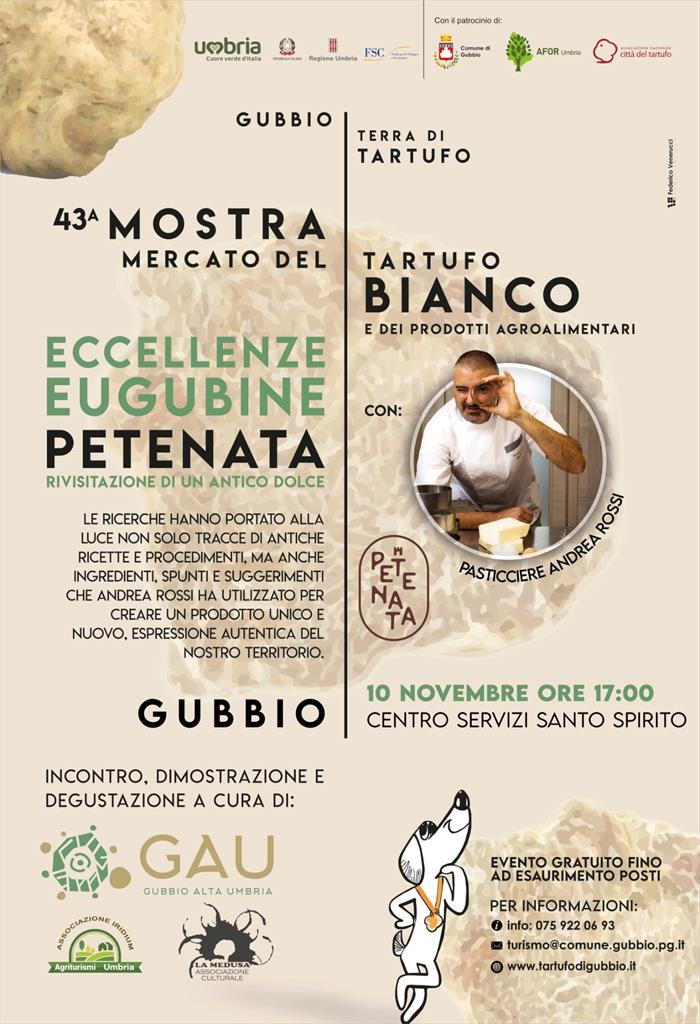 Torna nel weekend la Mostra mercato del Tartufo a Gubbio, secondo fine settimana dei tre previsti per quest'anno. Gli stand verranno allestiti sotto agli Arconi di Palazzo dei Consoli. In programma una serie di interessanti iniziative tra cui spicca alle ore 17, al Centro Servizi Santo Spirito l'appuntamento con la presentazione de “La Petenata”, un prodotto unico e nuovo, frutto di antiche ricette riscoperte e studi particolari: si tratta di un pane dolce realizzato da un noto pasticcere eugubino sulla scorta di ricerche accurate che affondano le radici nelle Tavole Eugubine, riadattate con un'impronta moderna. La presentazione di oggi è a cura dello storico Francesco Mariucci, della studiosa Silvia Alunno e del pasticcere Andrea Rossi, sotto l'egida del consorzio turistico GAU, che ha già promosso la mostra fotografica in corso alle sale degli arconi dedicata ai cavatori di tartufo.