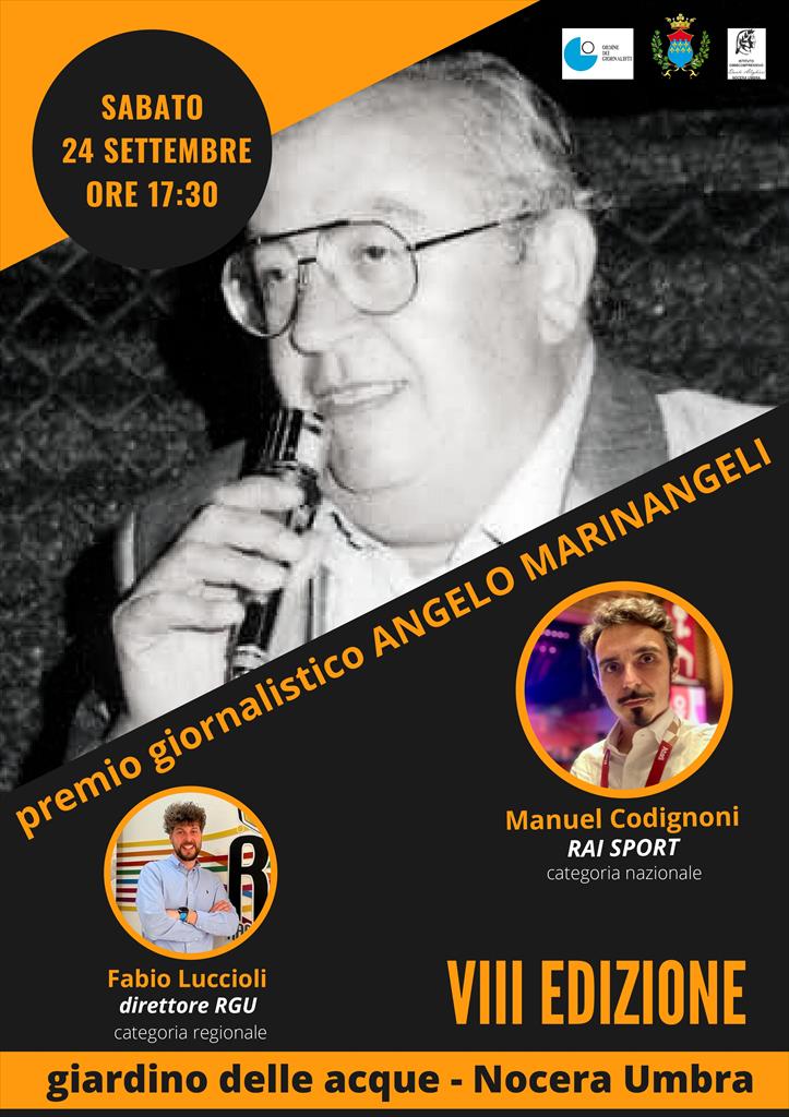 Manuel Codignoni per la categoria nazionale e Fabio Luccioli per quella regionale sono loro i vincitori dell'edizione 2022 del premio giornalistico "Angelo Marinangeli", dedicato al decano del giornalismo umbro, storica penna della Nazione e inventore del racconto radiofonico del calcio regionale dalle frequenze di Radio Subasio. La cerimonia di premiazione si svolgerà sabato 24 settembre alle ore 17.30 presso il Giardino delle acque di Nocera Umbra. In caso di maltempo la cerimonia si svolgerà all' interno della Pinacoteca comunale. Parteciperà all' incontro anche il presidente dell' Ordine dei giornalisti dell' Umbria, Mino Lorusso.