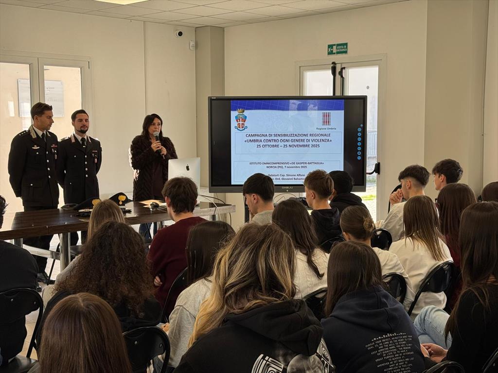 Nell’ambito della campagna di sensibilizzazione regionale “Umbria contro ogni genere di violenza", istituita con apposita deliberazione della Giunta Regionale, che avrà luogo dal 25 ottobre al 25 novembre di ogni anno, il Comando Legione Carabinieri “Umbria”, che vi ha aderito, ha pianificato degli incontri con gli studenti delle classi quinte degli Istituti Secondari di II grado ubicati nelle sedi dei Comandi Compagnia dell’Arma.