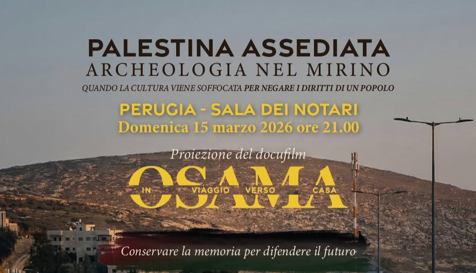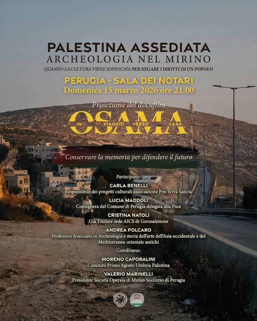 Domenica 15 marzo alle ore 21, alla Sala dei Notari, sarà proiettato il docufilm “Osama – In viaggio verso casa”, al centro dell’incontro pubblico “Palestina assediata – Archeologia nel mirino”, dedicato al tema della tutela del patrimonio culturale palestinese.Il film racconta la storia dell’archeologo palestinese Osama Hamdan, recentemente scomparso, e propone una riflessione sul valore della memoria e dei beni culturali come elementi fondamentali dell’identità dei popoli e come possibili strumenti di dialogo anche nei contesti segnati dal conflitto.Dopo la proiezione è previsto un confronto con Carla Benelli, responsabile dei progetti culturali dell’Associazione Pro Terra Sancta (in collegamento da Gerusalemme), Lucia Maddoli, consigliera del Comune di Perugia delegata alla Pace, Cristina Natoli, già titolare della sede AICS di Gerusalemme, e Andrea Polcaro, professore associato di Archeologia dell’Asia occidentale e del Mediterraneo orientale antichi.La serata sarà coordinata da Moreno Caporalini, del Comitato Primo Agosto Umbria Palestina, e da Valerio Marinelli, presidente della Società Operaia di Mutuo Soccorso di Perugia, promotori dell’iniziativa.«Non dobbiamo restare indifferenti né rassegnarci di fronte a quanto accade a Gaza, in Cisgiordania e in Libano e al dilagare della violenza», afferma Caporalini. «La storia di Osama ricorda che i beni culturali sono patrimonio dell’intera umanità e possono diventare terreno di dialogo».In questi giorni sono in preparazione, spiegano dal Comitato Primo Agosto Umbria Palestina, anche iniziative di collaborazione tra scuole umbre e scuole palestinesi, con l’obiettivo di rafforzare relazioni culturali e occasioni di conoscenza tra le giovani generazioni.