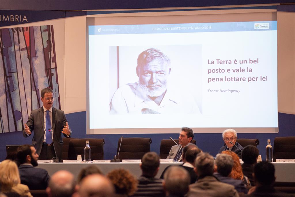 E' stato presentato questa mattina, presso l'Auditorium Confindustria il Bilancio di Sostenibilità 2018 di Gesenu. L’incontro si è svolto alla presenza di Otello Numerini Ass.re all’Ambiente, Lavori Pubblici, Infrastrutture, Aree Verdi del Comune di Perugia, Wladimiro De Nunzio Presidente Gesenu SpA, Luciano Piacenti Consigliere Delegato Gesenu SpA, Massimo Pera Direttore Operativo Gesenu SpA, Giovanni Vergari Responsabile Amministrazione Gesenu SpA, Riccardo Giannetta Responsabile Risorse Umane e Organizzazione Gesenu Spa, Chiara Consalvi Responsabile Affari Generali Gesenu Spa, Elisa Terrosi Internal Audit Gesenu Spa. Ha partecipato all’evento il neo Assessore Regionale all’Ambiente dott. Roberto Morroni. Il documento è il primo Bilancio di Sostenibilità che Gesenu predispone nel corso della propria storia, è anche il primo che viene redatto tra le utilities della Regione Umbria ed è uno strumento du comunicazione avanzato ed innovativo. Alla sua redazione ha partecipato l'intera struttura organizzativa della società, oltre alla collaborazione del Presidente Wladimiro De Nunzio, e a tale scopo Gesenu ha effettuato per la prima volta un'analisi di materialità che ha interessato tutti i propri stakeholders. Le tematiche legate alla salvaguardia dell’ambiente, all’economia circolare ed all’etica del business sono quelle che sono state percepite come predominanti. Durante l’incontro sono stati presentati dai vari relatori i contenuti del bilancio con riferimento ai suoi tre pilastri fondamentali, ambientale, economico e sociale e sono stati evidenziati gli effetti di mitigazione e miglioramento degli impatti che l’attività aziendale ha generato. Inoltre, sono stati illustrati i ritorni sotto il profilo del valore economico distribuito a vantaggio del territorio e dei dipendenti di Gesenu. La redazione del documento del Bilancio di Sostenibilità è stata condivisa con l’Associazione FISE Assoambiente.