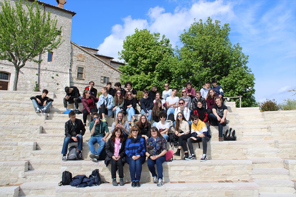 Nelle due città, inoltre, i pomeriggi sono stati dedicati alla conoscenza di musei e luoghi di centrale interesse. In Italia il progetto di approfondimento linguistico ha interessato la conoscenza di alcuni territori dell'Umbria, con i suoi usi e costumi. Oltre ad Assisi, i ragazzi hanno scoperto le bellezze architettonico-naturalistiche di Spello, Perugia e Gubbio, per un primo maggio all'insegna dell'internazionalità. Già conoscitori della Festa dei Ceri e della città, i ragazzi e le loro insegnanti di italiano e neo greco, Emese Erhardt e Judit Moharos-Alszaszy, sono stati accompagnati nella conoscenza di vari gioielli culturali della città: dal Teatro Romano alla Chiesa di San Giovanni e di San Marziale, dove gli studenti si sono divertiti a riconoscere gli scorci della nota fiction Don Matteo, tradotta anche in ungherese. A non mancare, poi, la visita alla fontana del Bargello dove alunni ed insegnanti sono stati insigniti del titolo “Matti di Gubbio”, con tanto di attestato pronto a viaggiare per l'Europa e dopo la visita al Palazzo dei Consoli e Palazzo Ducale, in cui hanno scoperto la storia più preziosa custodita dalla città di pietra, in funivia sono arrivati fino alla Basilica di Sant'Ubaldo dove hanno potuto conoscere più da vicino e toccare con mano la Festa dei Ceri, riscendendo a piedi per gli stradoni del Monte Ingino, a loro già noti per essere le basi dell'Albero di Natale più grande del mondo, ed impersonificandosi nella fatica e nella passione vissuta dai ceraioli.