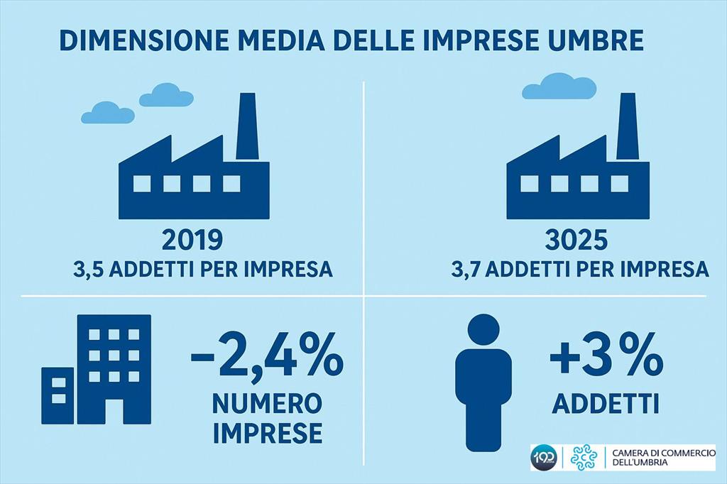 Collocare i dati umbri nel quadro nazionale aiuta a leggere la traiettoria. L’Italia, pur restando sopra nei valori assoluti, nella crescita dimensionale delle aziende non ha registrato lo stesso ritmo dell’Umbria post-2019. Nel Centro Italia, invece, la contrazione del numero di imprese non è stata compensata da una crescita analoga degli addetti. L’Umbria si distingue dunque per un modello meno statico, che riduce le fragilità e si avvicina a configurazioni più solide.