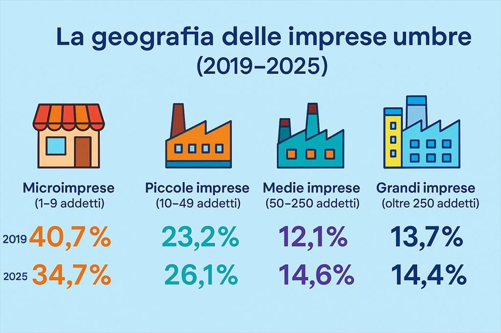 Il cambiamento non nasce dal caso. Negli ultimi anni in Umbria si è lavorato per innalzare la taglia media d’impresa attraverso bandi con fondi europei e programmi di formazione rivolti sia a imprenditori che a dipendenti. Queste leve hanno sostenuto investimenti, digitalizzazione e aggiornamento organizzativo. Un percorso che ha permesso ad alcune micro di diventare piccole e a diverse piccole di crescere ulteriormente. La crescita dimensionale è quindi l’esito di politiche mirate ma anche di una selezione spontanea: le imprese meno attrezzate hanno ceduto il passo a quelle capaci di strutturarsi.