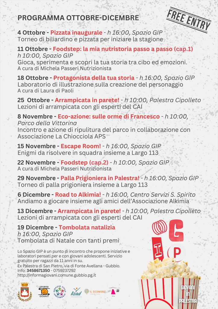 Ripartono a Gubbio le iniziative di GIP Giovani in Palestra 2025/26, attività gratuite e per giovani dagli 11 anni in su, nell'ex Palestra di San Pietro. L’apertura di stagione negli scorsi giorni con la pizzata e il torneo di biliardino. Tra i prossimi appuntamenti: 11 Ottobre Foodstep: la mia nutristoria passo a passo; 18 Ottobre – il Laboratorio di illustrazione sulla creazione del personaggio e il 25 Ottobre l'Arrampicata con gli esperti del CAI alla Palestra di Cipolleto. Lo Spazio GIP è curato dalla Cooperativa Sociale ASAD per il Comune di Gubbio – Ufficio Informagiovani e Politiche Giovanili.