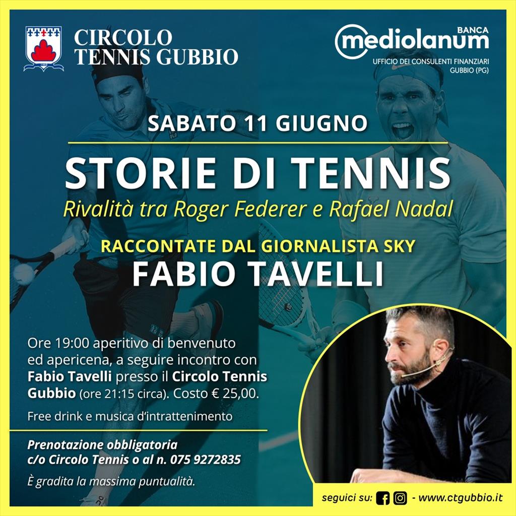 Parte alla grande l'estate 2022 al Circolo Tennis Gubbio. Ad aprire la stagione alle porte un ospite d'eccezione: il giornalista sportivo, volto noto di Sky Sport, Fabio Tavelli. Il narratore si cimenterà in "Storie di Tennis: la rivalità tra Roger Federer e Rafael Nadal", un avvincente storytelling sulla più grande sfida della storia moderna del tennis, quella tra lo svizzero e lo spagnolo, attraverso immagini, filmati e testimonianze. Un evento, organizzato dal CT Gubbio in collaborazione con i Consulenti Finanziari di Gubbio di Banca Mediolanum, da non perdere per tutti gli amanti del tennis e dello sport. Ingresso libero. L'appuntamento è fissato in calendario per sabato 11 giugno alle ore 21:15. Su prenotazione è previsto, dalle ore 19.00, un apericena. Info e prenotazioni allo 075/9272835.